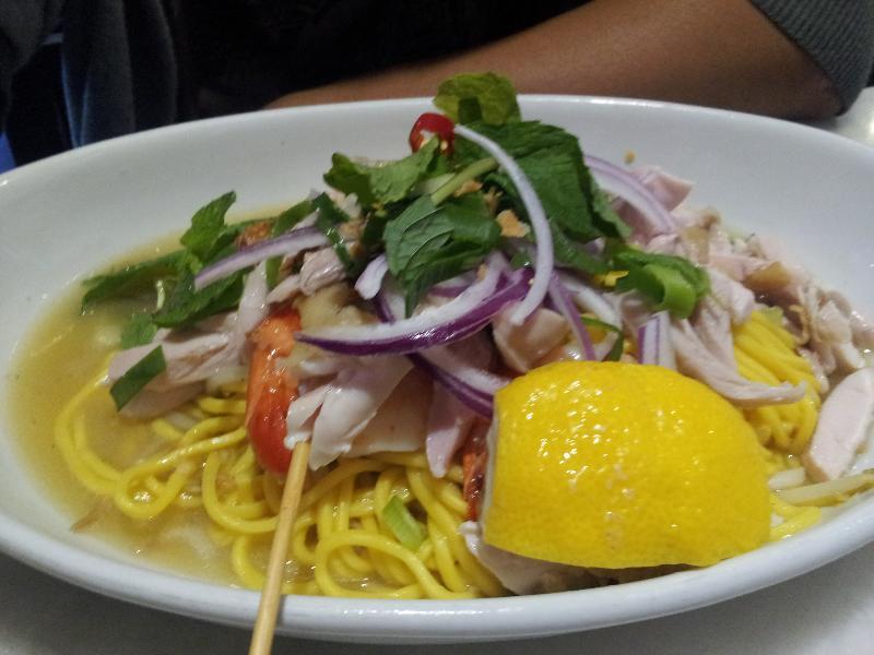 VGirl ordered the vegetarian Singaporean laksa and wanted it mild, also lemonade. I can't stress to you how huge this bowl was, it was a trough of laksa soup! I didn't try it until the very end, and that was just a sip of her broth. It was a nice mild bite, nothing too special. She kept finding weird unidentifiable vegetables in her laksa, for a vegetarian she isn't very good is she? She couldn't identify the eggplant they had slipped in despite it having small stripes of the purple skin.